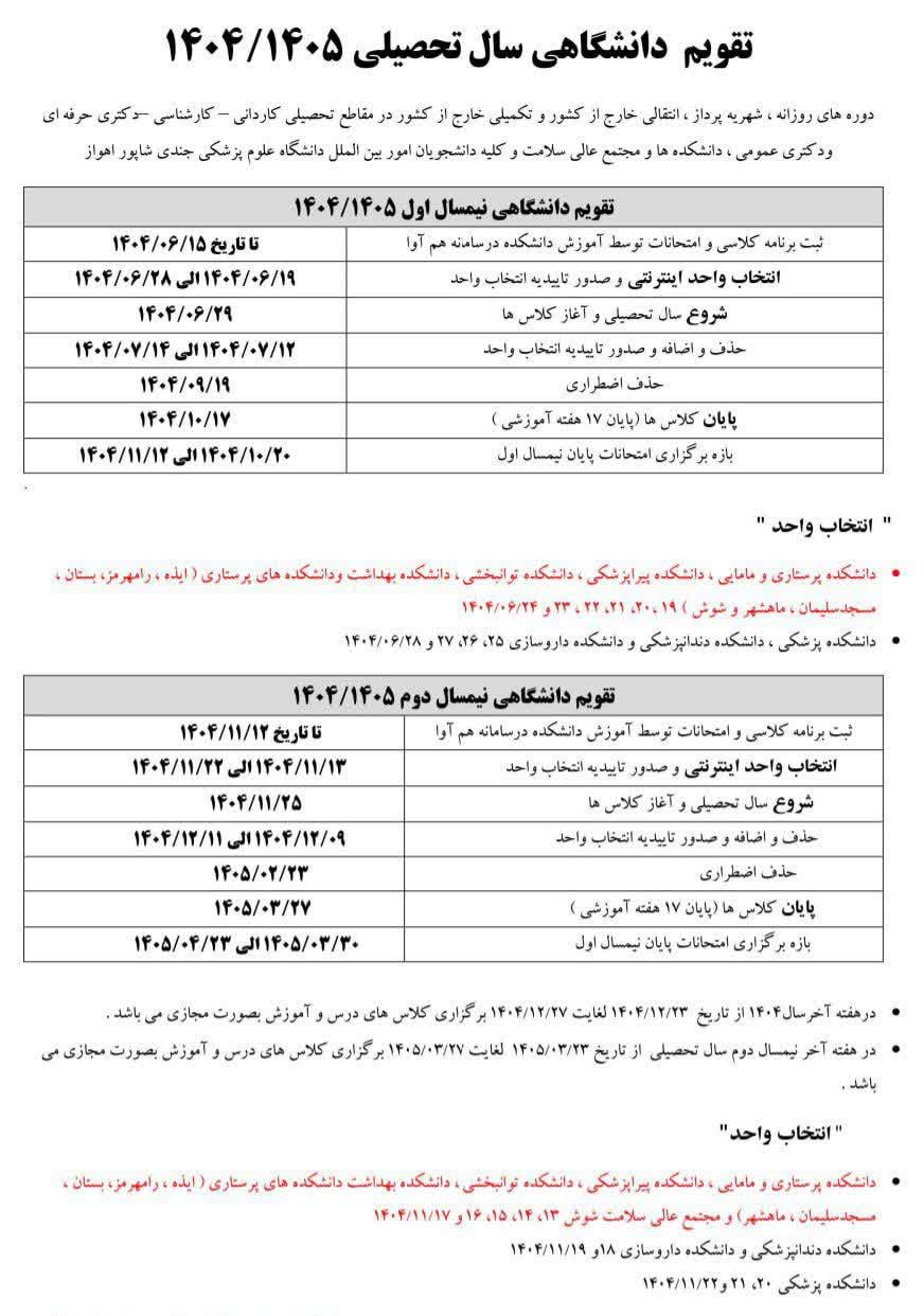 تقویم دانشگاهی نیمسال اول 1404-1405