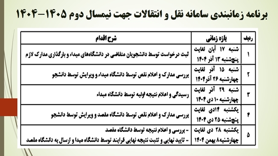 برنامه زمان بندی نقل و انتقالات دانشجویان نیمسال دوم 1405-1404